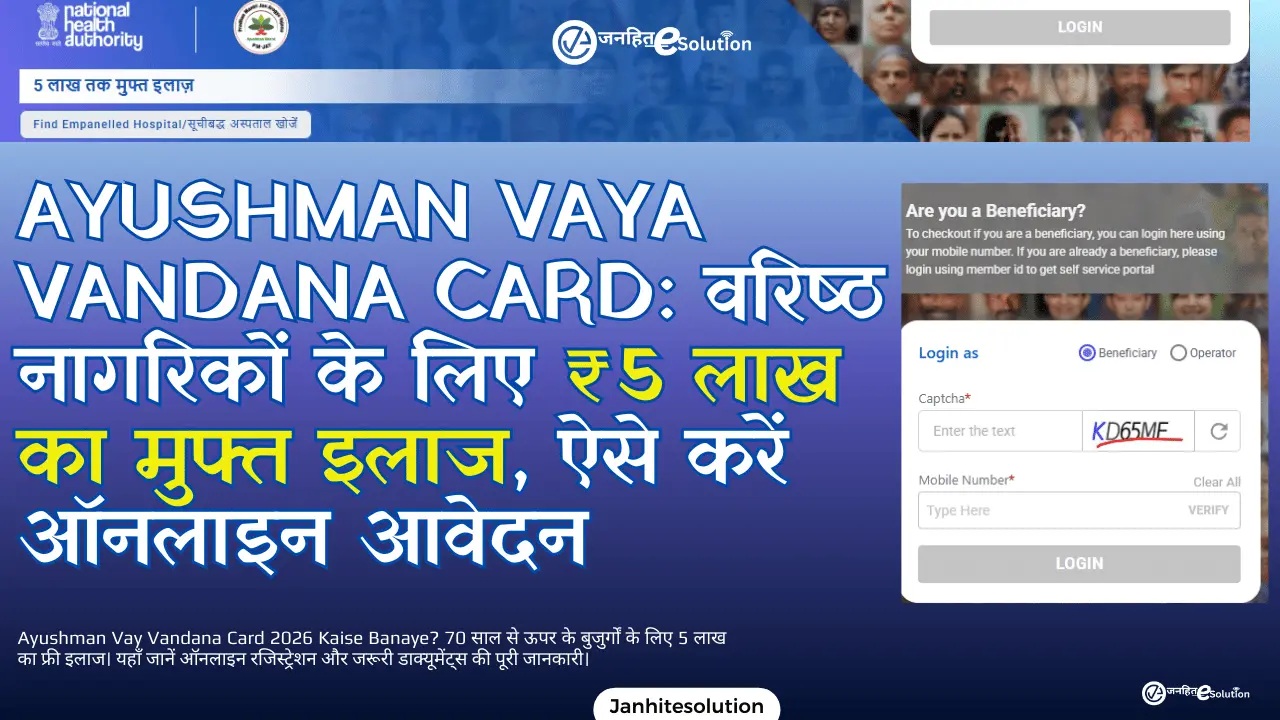 भारत में बुजुर्गों के बेहतर स्वास्थ्य और देखभाल के लिए केंद्र सरकार ने एक अत्यंत कल्याणकारी कदम उठाया है। अब 70 वर्ष से अधिक आयु के सभी वरिष्ठ नागरिकों के लिए आयुष्मान वय वंदना कार्ड की सुविधा शुरू की गई है। अक्सर बढ़ती उम्र के साथ स्वास्थ्य संबंधी खर्चे बढ़ जाते हैं और कई बार आर्थिक तंगी के कारण बुजुर्ग सही इलाज नहीं करवा पाते। इसी समस्या का समाधान करने के लिए सरकार ने यह नई योजना पेश की है। जनहित ई सॉल्यूशन पर हमारा उद्देश्य आपको जटिल सरकारी प्रक्रियाओं को आसान भाषा में समझाना है ताकि आप बिना किसी परेशानी के सरकारी योजनाओं का लाभ ले सकें। Ayushman Vay Vandana Card 2026 Kaise Banaye इसकी पूरी जानकारी होने से आप अपने घर के बड़े बुजुर्गों का भविष्य सुरक्षित कर सकते हैं।