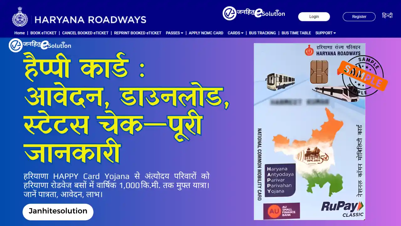 हरियाणा सरकार ने अंत्योदय परिवारों की मूवमेंट को आसान बनाने और उनकी आर्थिक मदद करने के लिए HAPPY Card Yojana (Haryana Antyodaya Parivar Parivahan Yojana) शुरू की है। यह योजना अंत्योदय परिवारों को हरियाणा रोडवेज की बसों में वार्षिक 1,000 किलोमीटर तक मुफ्त यात्रा का लाभ देती है। महज ₹50 की एकमुश्त फीस देकर पाने वाला HAPPY Card एक स्मार्ट NCMC कार्ड होता है—जिसकी पूरी लागत और रखरखाव सरकार वहन करती है