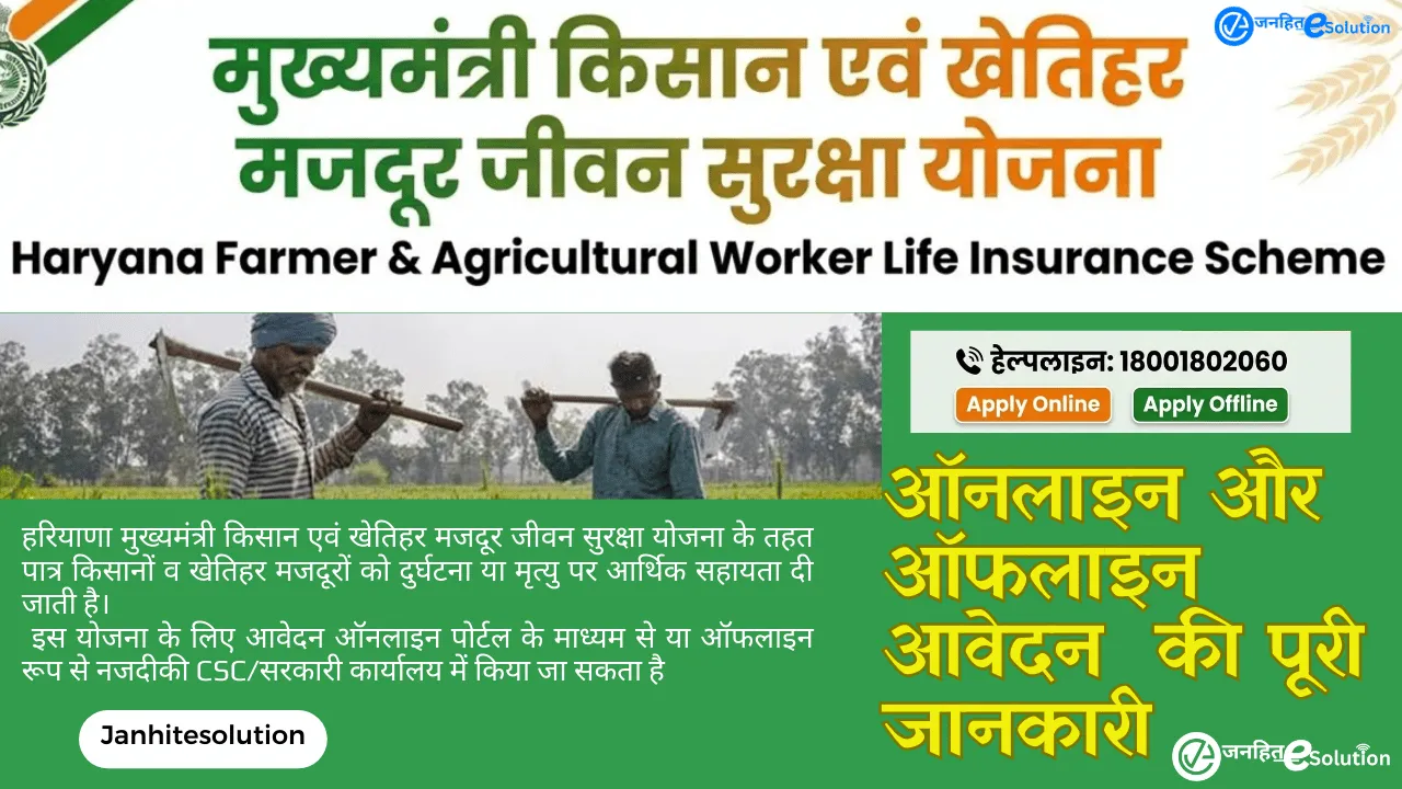 हरियाणा सरकार ने किसानों और खेतिहर मजदूरों को कृषि कार्य के दौरान होने वाली दुर्घटनाओं से आर्थिक सुरक्षा देने के लिए मुख्यमंत्री किसान एवं खेतिहर मजदूर जीवन सुरक्षा योजना शुरू की है। इस योजना के तहत दुर्घटना, अपंगता या मृत्यु की स्थिति में आर्थिक सहायता प्रदान की जाती है। लाभार्थी अब ऑनलाइन और ऑफलाइन दोनों तरीकों से आवेदन कर सकते हैं। इस लेख में हम दोनों प्रक्रियाओं का step-by-step विवरण देंगे ताकि आप आसानी से आवेदन कर सकें।