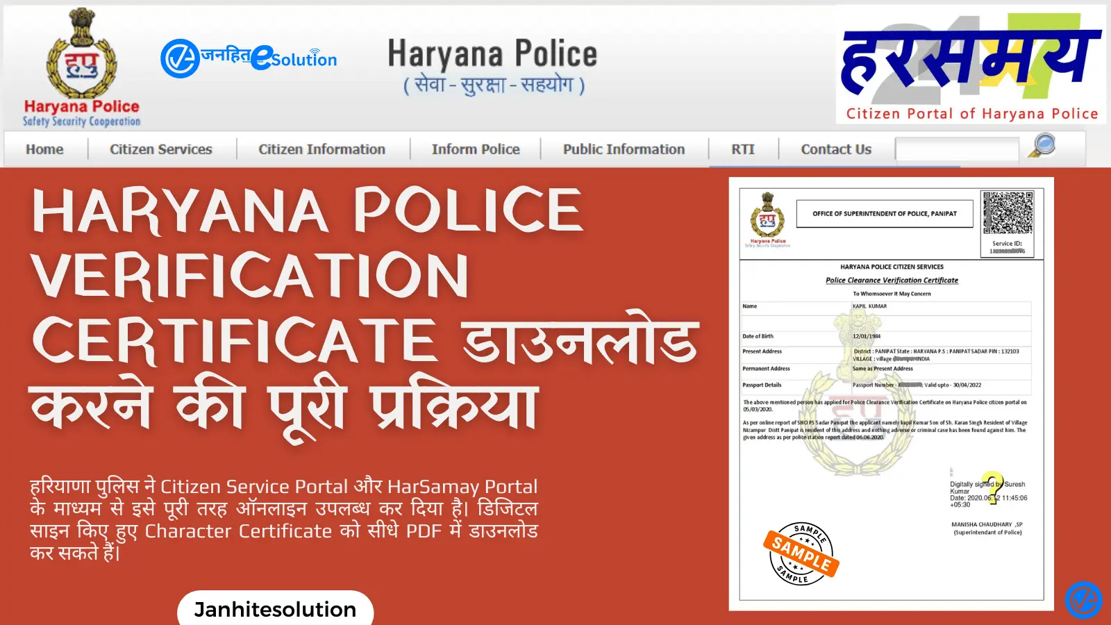 Haryana Police Verification Certificate : हरियाणा में नौकरी, पासपोर्ट, या अन्य सरकारी और निजी कामों के लिए पुलिस वेरिफिकेशन सर्टिफिकेट (Character Certificate / Police Verification Certificate) आवश्यक होता है। पहले इसे पाने के लिए व्यक्ति को थाने या जिला पुलिस कार्यालय जाना पड़ता था, लेकिन अब हरियाणा पुलिस ने Citizen Service Portal और HarSamay Portal के माध्यम से इसे पूरी तरह ऑनलाइन उपलब्ध कर दिया है।
