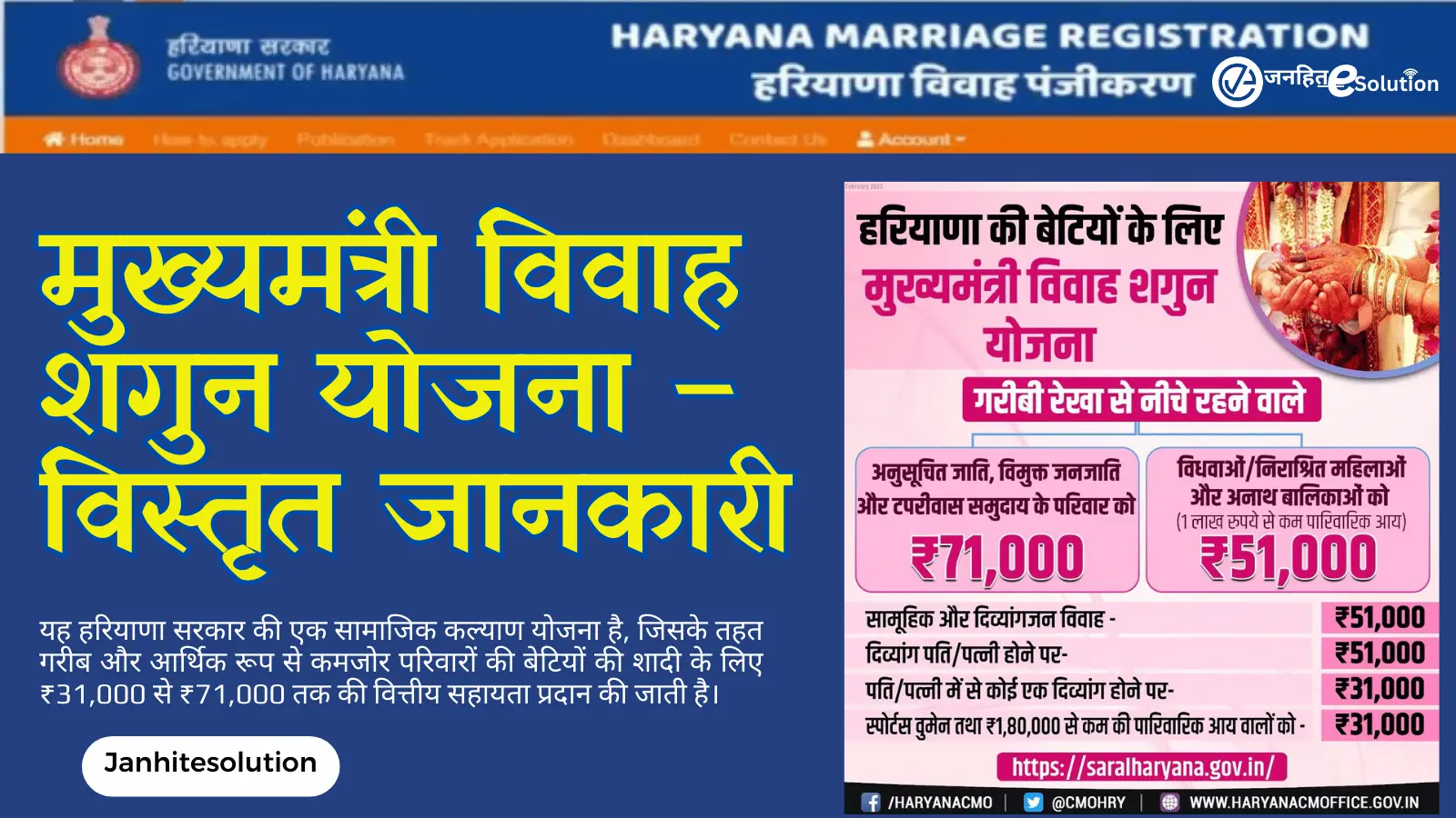 Mukhyamantri Vivah Shagun Yojana हरियाणा सरकार की एक सामाजिक कल्याण योजना है, जिसके तहत गरीब और आर्थिक रूप से कमजोर परिवारों की बेटियों की शादी के लिए ₹31,000 से ₹71,000 तक की वित्तीय सहायता प्रदान की जाती है।