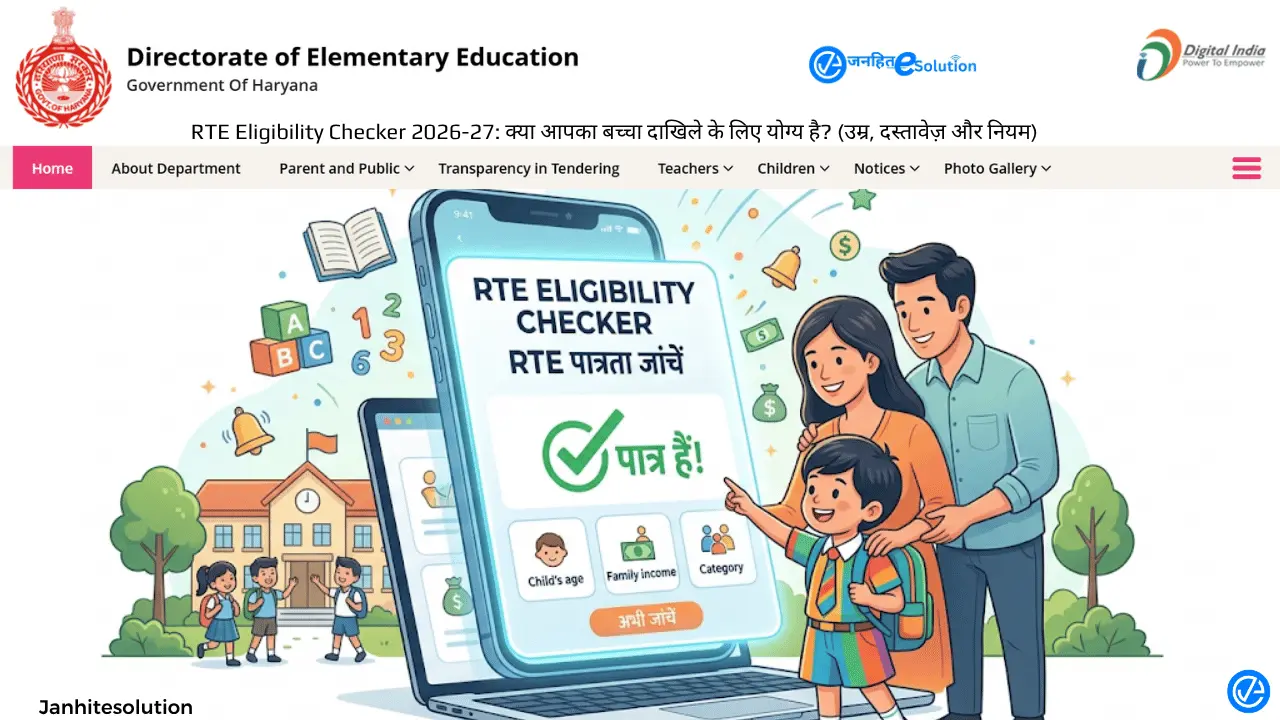 Janhit e-Solution पर दी गई RTE Eligibility Checker से जुडी जानकारी हरियाणा मौलिक शिक्षा निदेशालय द्वारा जारी RTE Act 2009 और शैक्षणिक सत्र 2026-27 के आधिकारिक नोटिफिकेशन पर आधारित है। हमारा उद्देश्य अभिभावकों को सटीक और पारदर्शी जानकारी देना है। हम किसी भी प्रकार की फॉर्म फीस नहीं लेते हैं, सरकारी पोर्टल पर आवेदन पूरी तरह से निःशुल्क है।